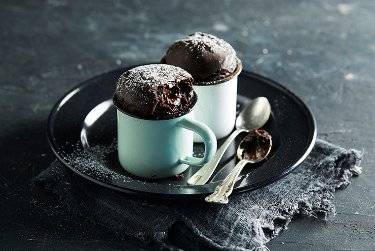 En una taza (tipo café con leche) apta para microondas disponer la harina, el azúcar, el cacao, el polvo para hornear, el Aceite Puro de Girasol Natura, la leche y el huevo. Integrar bien hasta obtener una mezcla homogénea. Hundir en el centro de la mezcla el cuadradito de chocolate amargo y cocinar durante dos minutos y medio en microondas a máxima potencia (**). Retirar, dejar entibiar, espolvorear con el azúcar impalpable y servir en la taza. Ideal para cucharear.