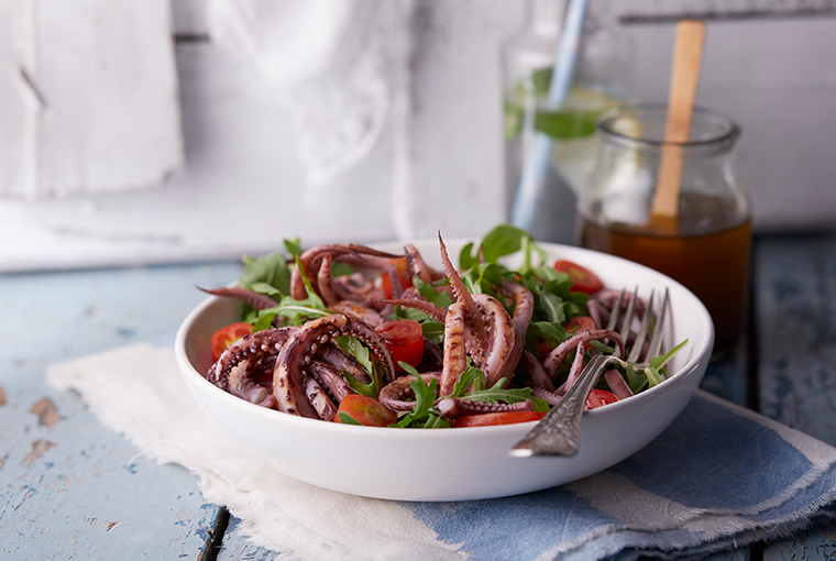 Disponer los tentáculos de calamar cortados en trozos pequeños en una ensaladera, agregar la rúcula cortada finamente y los tomates cherrys limpios y cortados en cuartos.