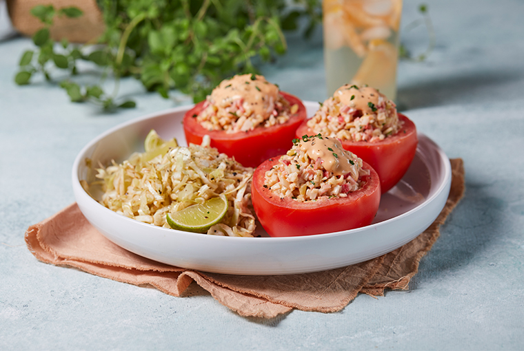 Tomates rellenos de trigo candeal y kanikama con guarnición