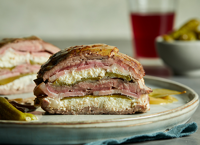 Para el armado de la torre, disponer un bife de nalga sobre una tabla de cocina, salpimentar a gusto, pincelar con Mostaza Natura y cubrirlo con tres o cuatro fetas de panceta. Agregar en forma de capas los pepinillos, los aros de cebolla y la ricota. Cubrir con otro bife y repetir la misma operación hasta terminar la torre con el último bife.