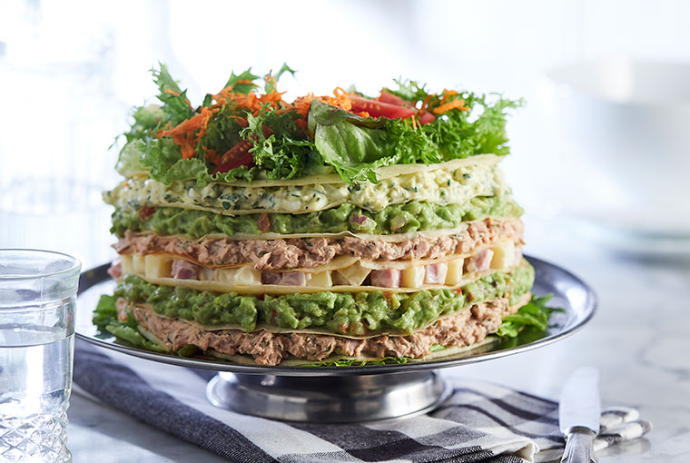 Comenzar con el armado de la torre, disponer sobre una fuente redonda un panqueque, untarlo con Mayonesa Natura cubriéndolo bien, disponer las hojas de lechuga mixta, aderezar las hojas con Mayonesa Natura y cubrir con otro panqueque haciendo presión con los dedos. Continuar en forma de capas intercaladas por los panqueques con una capa generosa de la crema de atún, otra de palta, otra con el jamón y queso y repetir una con la crema de atún y otra con la de palta. Luego, cubrir con una capa de huevo picado, cubrir con un panqueque, distribuir Mayonesa Natura y decorar con las hojas de lechuga mixta, la zanahoria rallada y los tomates cherrys cortados a la mitad o en cuartos. Condimentar con una pizca de sal y un hilo de Aceite de Oliva Selección Natura.