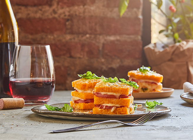 Para el armado, pincelar una placa con Aceite Blend Natura y disponer un cuadrado de polenta, por encima de este, una rodaja de tomate, jamón cocido, un puñadito de queso en hebras y terminar la torre con otro cuadrado de polenta. Repetir esta operación hasta terminar los ingredientes colocando las torrecitas unas separadas mínimamente unas de otras. Espolvorear con el queso rallado y llevar a horno precalentado hasta gratinar.
