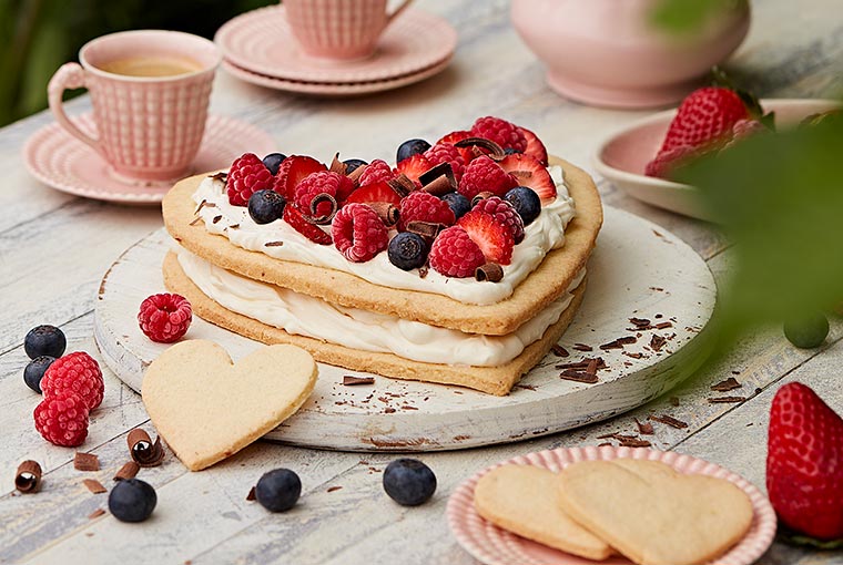 Para el armado de la torta, distribuir la mitad de la crema sobre uno de los corazones, cubrir con el otro corazón y terminar la decoración con copos de crema, frutos rojos, las galletitas espolvoreadas con azúcar impalpable y el chocolate amargo en láminas.