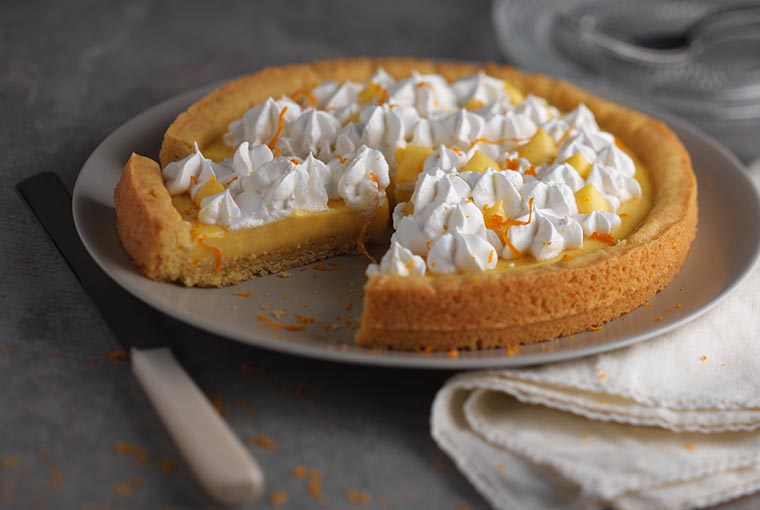 Para el armado, rellenar la base de la torta con la crema de naranja, nivelar bien y decorar con el merengue. Opcional: dorar el merengue con soplete de cocina o unos minutos en el cajón del horno a fuego fuerte.