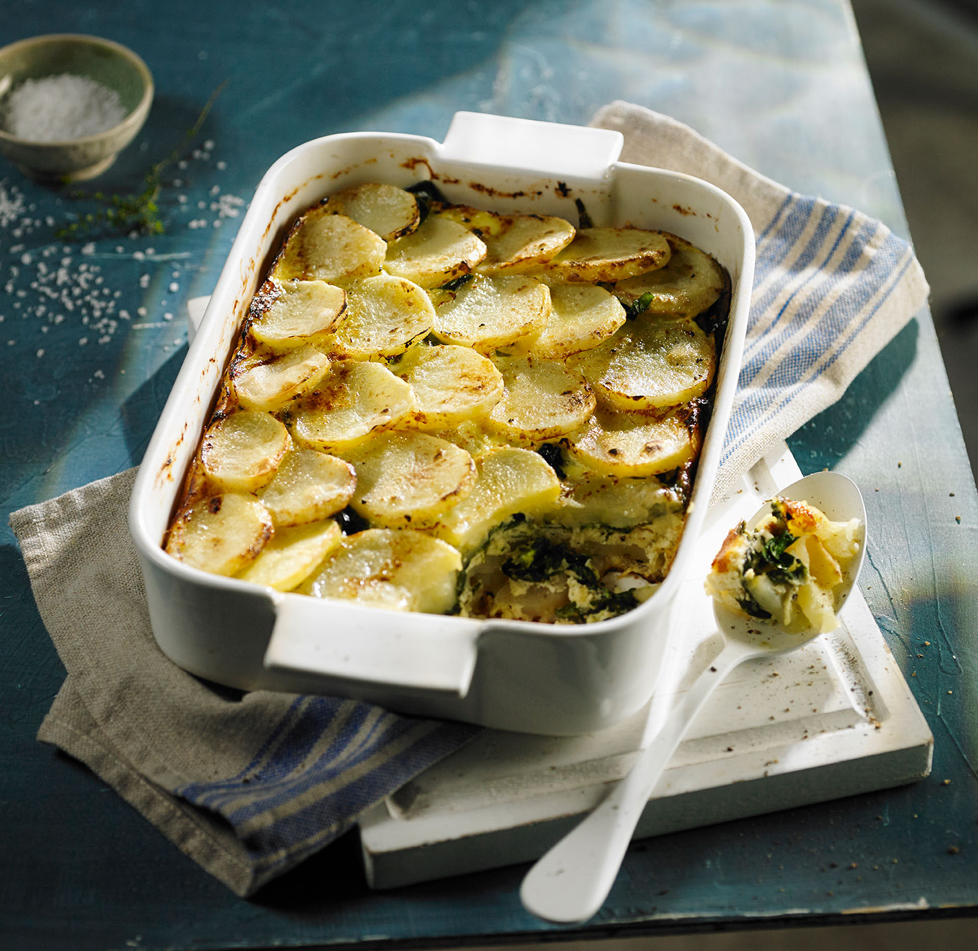 Lubricar una tartera con Rocío Vegetal Natura, forrarla con una capa de fetas de papas, cubrir con la preparación de ricota y colocar por encima ¾ partes de las espinacas cocidas. Verter por encima el batido de huevos y colocar el resto de las fetas de papas. Decorar con el resto de las espinacas cocidas.