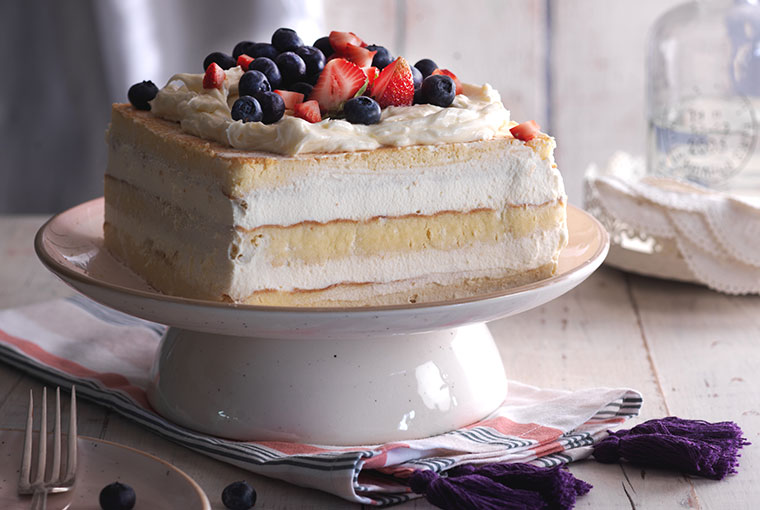 Aparte batir la crema con la esencia de vainilla y edulcorante líquido. Decorar la torta con la crema batida y los arándanos a gusto.
