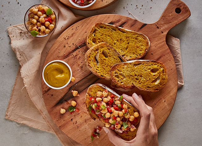 Disponer las tostadas en una fuente colocando por encima una cucharada generosa de criolla de garbanzos.