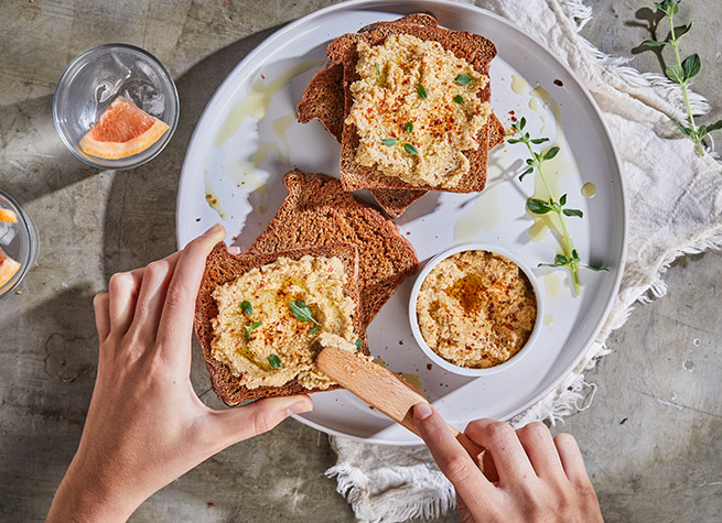 Enjuagar bien las semillas de girasol bajo el agua corriente para limpiarlas del agua de remojo, escurrir y disponerlas en una procesadora. Agregar el jugo de limón, el diente de ajo que se utilizó para saborizar el pan, la pizca de ají molido, el restante Aceite de Oliva Selección Natura y ajustar con sal y pimienta a gusto. Procesar todo hasta obtener una pasta lisa y homogénea, de ser necesario agregar un poco más de jugo de limón o aceite.