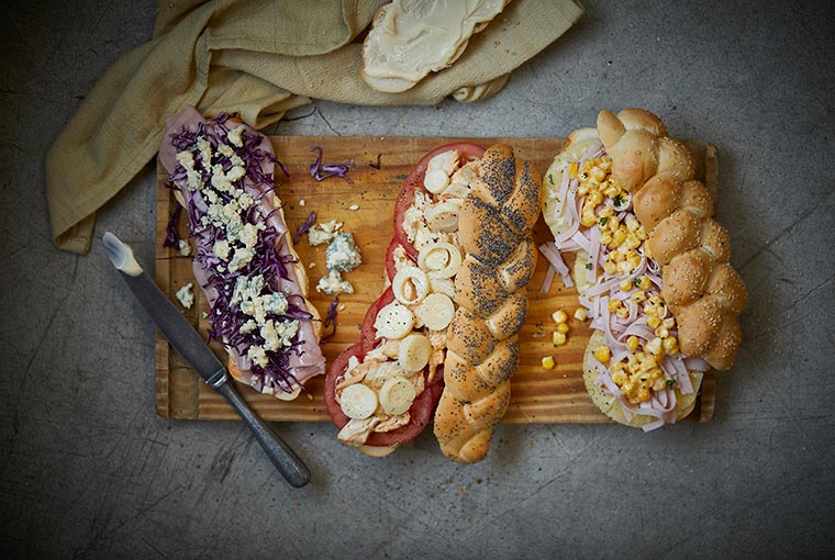 Abrir el pan, colocar sobre la base el tomate en rodajas, sazonarlos con una pizca de sal y disponer sobre ellos la mezcla de pollo, palmitos y salsa golf. Cerrar el sándwich y servir.