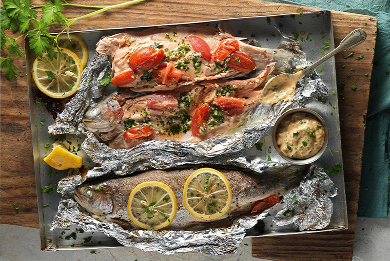 Retirar las truchas y servirlas calientes en el mismo papel aluminio, descartando la cubierta. Acompañarlas con el aderezo de Salsa Golf Natura.