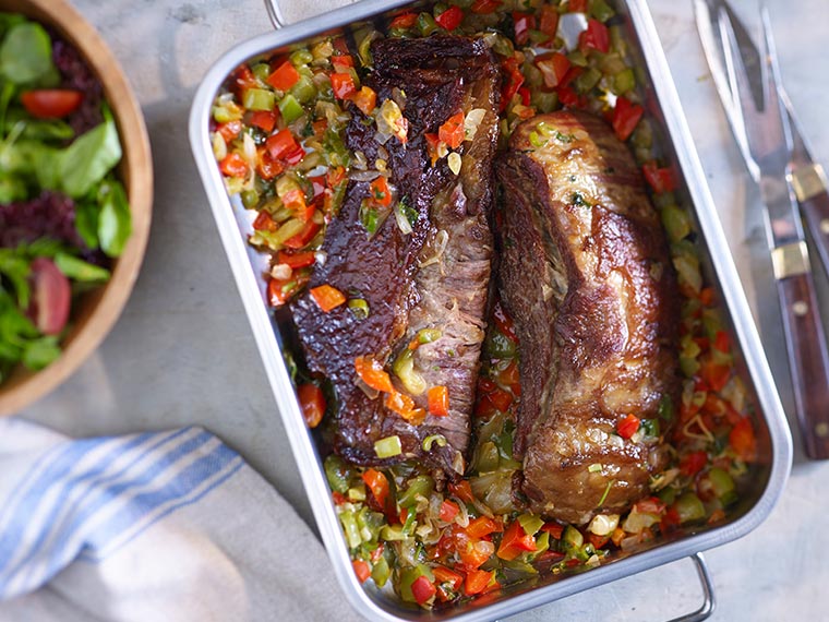 Picar las cebollas. Quitarle las semillas y la parte blanca a los ajíes y luego picarlos. Colocar las cebollas, los ajíes, el tomate, el vinagre, el Aceite de Girasol Natura y todos los condimentos en un recipiente. Mezclar bien y verter sobre el vacío. Llevar la carne a horno medio durante 40 a 50 minutos, dependiendo del punto en que se desee.