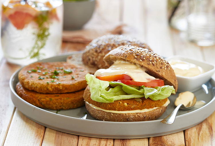 Para el armado de las Veg Burger, distribuir las hojas de lechugas sobre las bases de los panes, por encima las rodajas de tomate, sobre ellas las hamburguesas, completar con un copo de Mayonesa Natura y cerrar con las tapas de los panes.