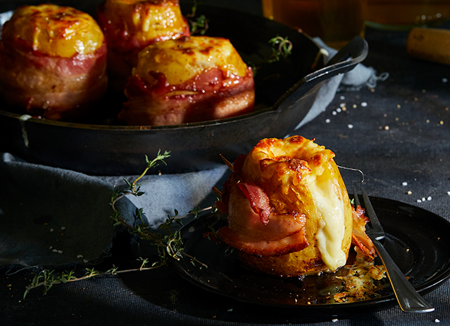 Pincelar por fuera las papas con la Mostaza Natura y envolverlas con las fetas de panceta. Disponerlas sobre una placa para horno previamente lubricada con Rocío Vegetal Natura, rellenarlas con la muzzarella, llevar nuevamente a horno durante 10 minutos hasta gratinar, retirar, servir bien calientes decoradas con el perejil picado.