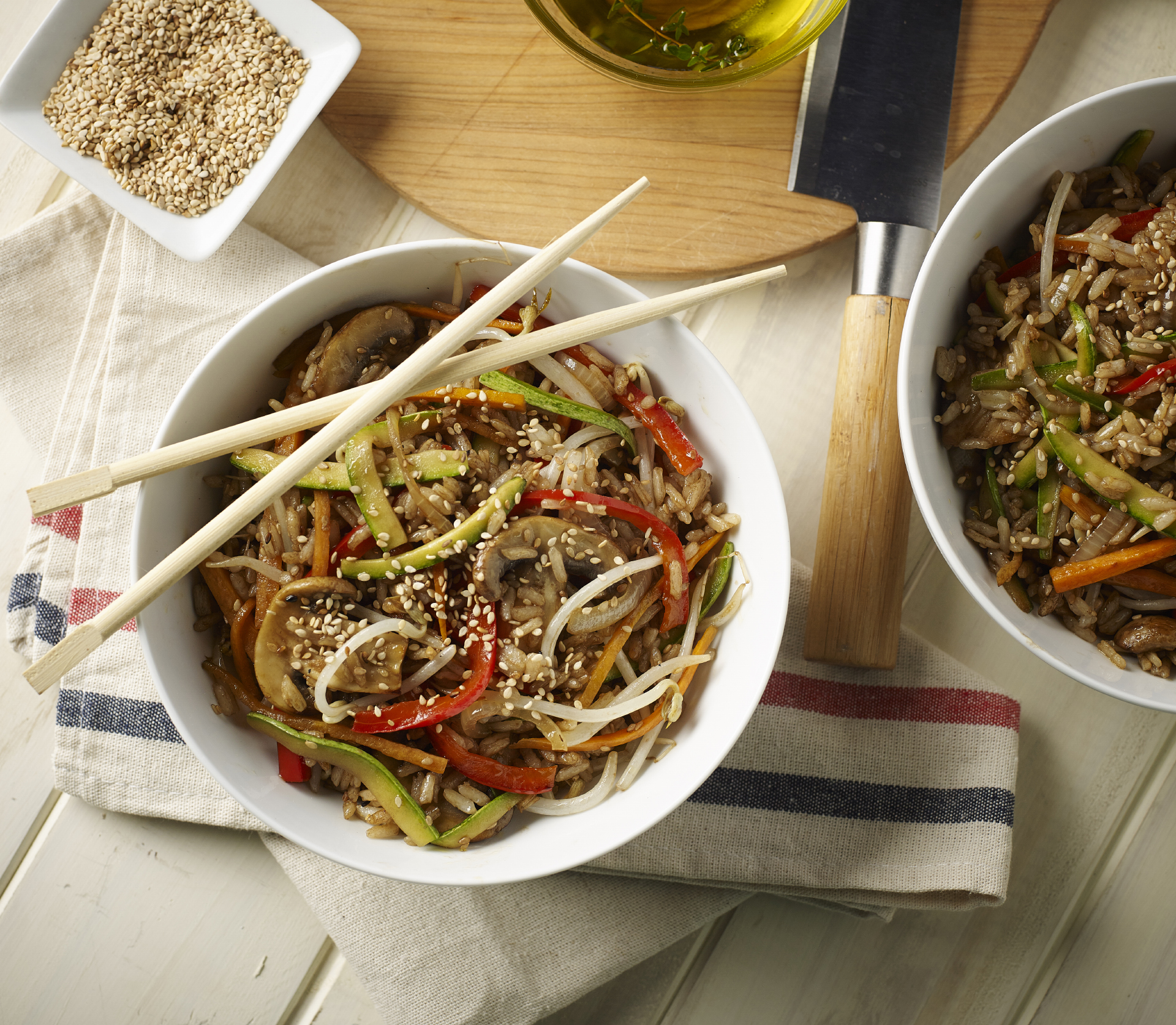 Calentar en una olla grande el Aceite Natura Blend, añadir las cebollas, los ajos y el ají morrón y dejar cocinar hasta que estén algo tiernos. Incorporar la zanahoria, los zucchinis, los champiñones y dejar cocinar unos minutos hasta que estén tiernos. Salpimentar a gusto. Una vez que todos los vegetales estén cocidos y tiernos incorporar el arroz previamente cocido. Rectificar el condimento y de ser necesario añadir una cucharada más de Aceite Natura Blend. Agregar los brotes de soja junto con la salsa y las semillas. Cocinar uno o dos minutos más integrando bien y retirar del fuego.